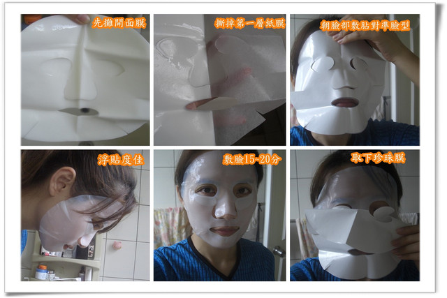 使用方式:攤開面膜後,先撕開第一層的紙膜,然後將生物纖維面膜朝臉部敷貼,再撕開珍珠膜,敷臉15~20分即可,不需沖洗