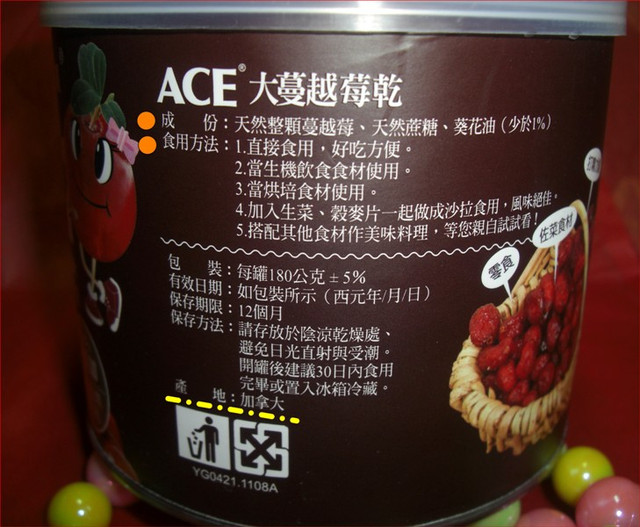 成份:天然整顆蔓越莓、天然蔗糖、葵花油(少於1%)。