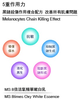 尖端亮白分子、維他命A醇 、薰衣草精油、傳明酸、玻尿酸。