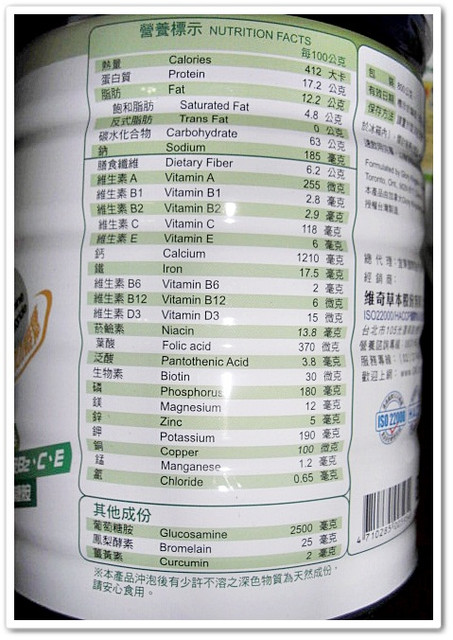 主成份:大豆蛋白、麥芽萃取物、菊糖、全穀小麥、維生素與礦物質、
