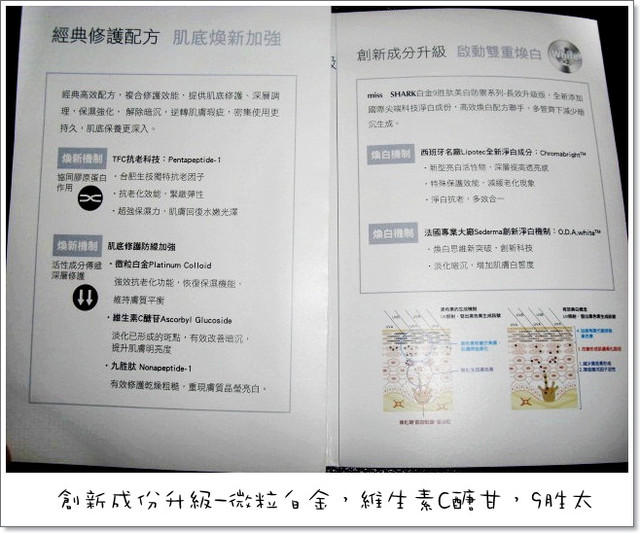 含高科技白金微粒、維生素C醣、O.D.A.white等美白成分,