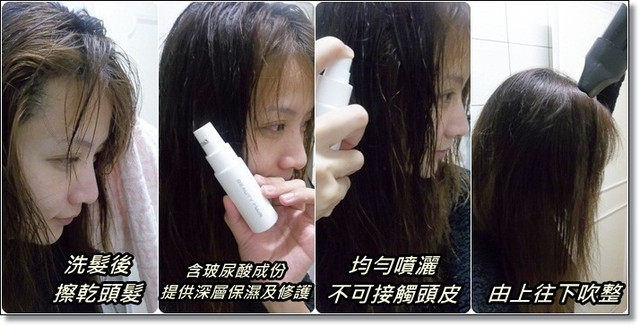 因為含玻尿酸成分,能加強髮絲的保濕與潤澤修護的功效,所以使用滑滑噴霧後吹整,