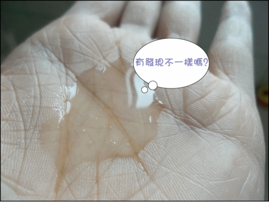 無色,無味,有點滑潤(偏像精華液般的質地),最特別的是竟然有像碎金箔般的亮粉內,