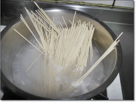 先將麵體丟入鍋中,待5分鐘後撈起。